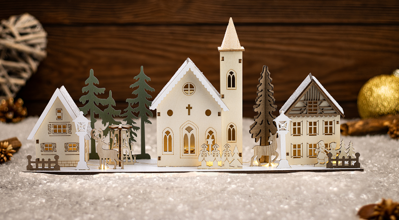 LED karácsonyi falu, fa, elemes,Timer 6+18h, 10LED, 3000K, 2xAA,CHRVILC10WW