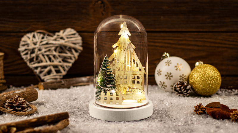 LED karácsonyi házikó burában,fa, elemes , Timer 6+18h, 10LED, 3000K, 2xAAA,CHRHB10WW