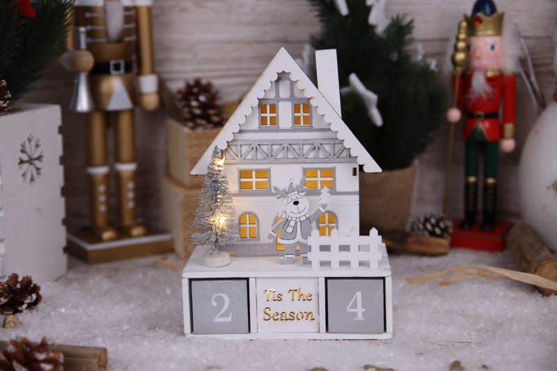 Led karácsonyi kocka naptár, házikó, fa, elemes Timer 6+18h,8LED, 3000K, 2xAA CHRACHR8WW