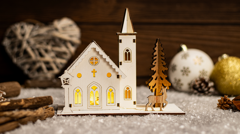 LED karácsonyi templom, fa, elemes,Timer 6+18h, 3LED, 3000K, 2xAAA,CHRHC3WW