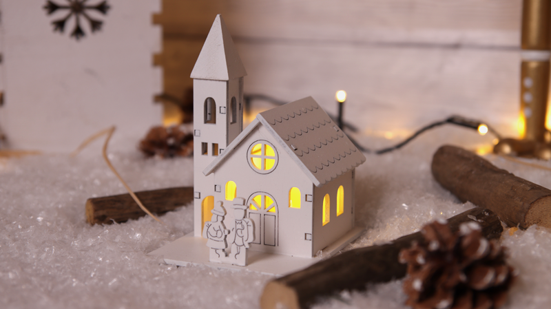 LED karácsonyi templom,fa,fehér,elemes, 1LED, 3000K, 1xCR2032, CHRC1WW
