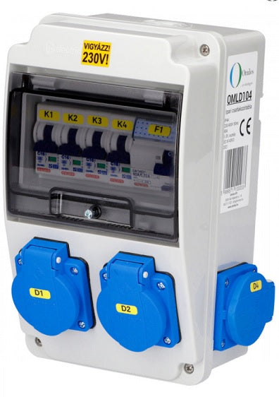 Szerelt ipari csatlakozótábla 4x 230V dugalj 4x 1P C16A 6kA kismegszakító 1x 2P 40A 30mA Fí-relé IP44 védelem OMDL104